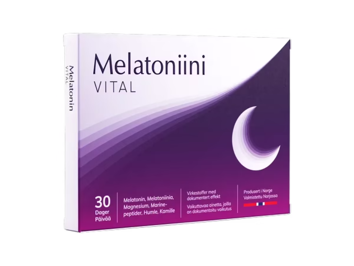 Melatoniini Vital on ravintolisä, joka sisältää 1 mg melatoniinia. Melatoniini auttaa lyhentämään nukahtamisaikaa, kun sitä otetaan ennen nukkumaanmenoa.